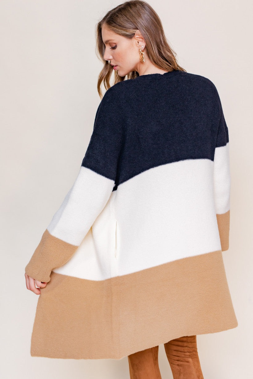 Long color block cardigan with side pockets. With an oversized fit and such a cozy touch, you will be wearing this cardigan in the cold brisk air.